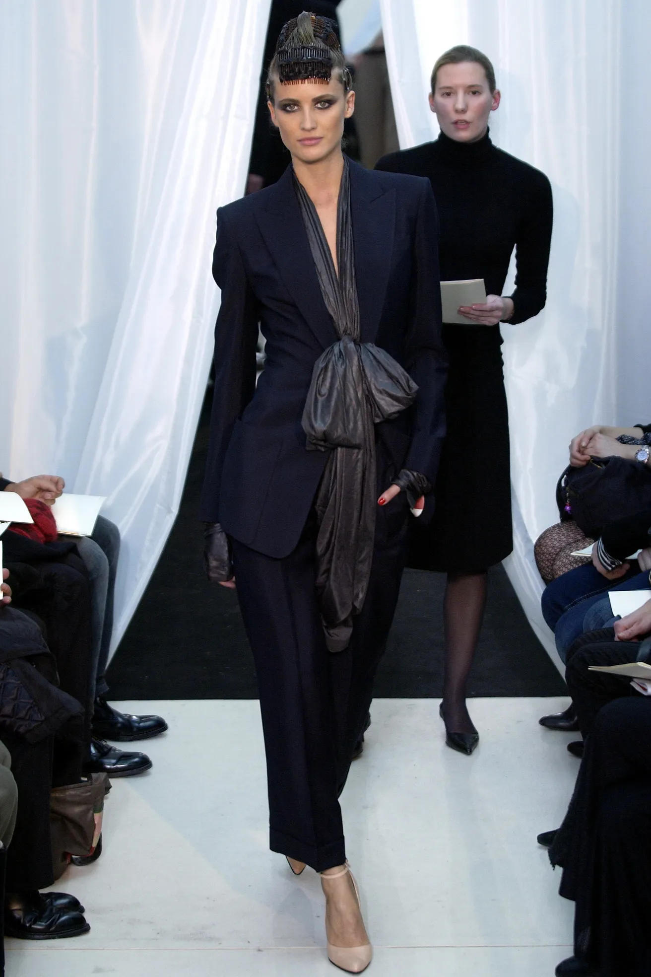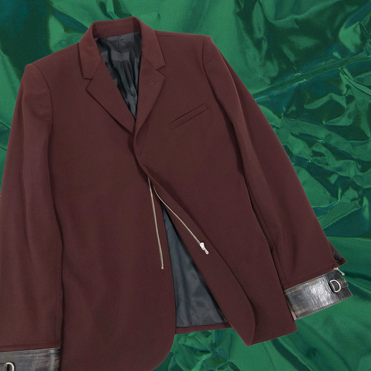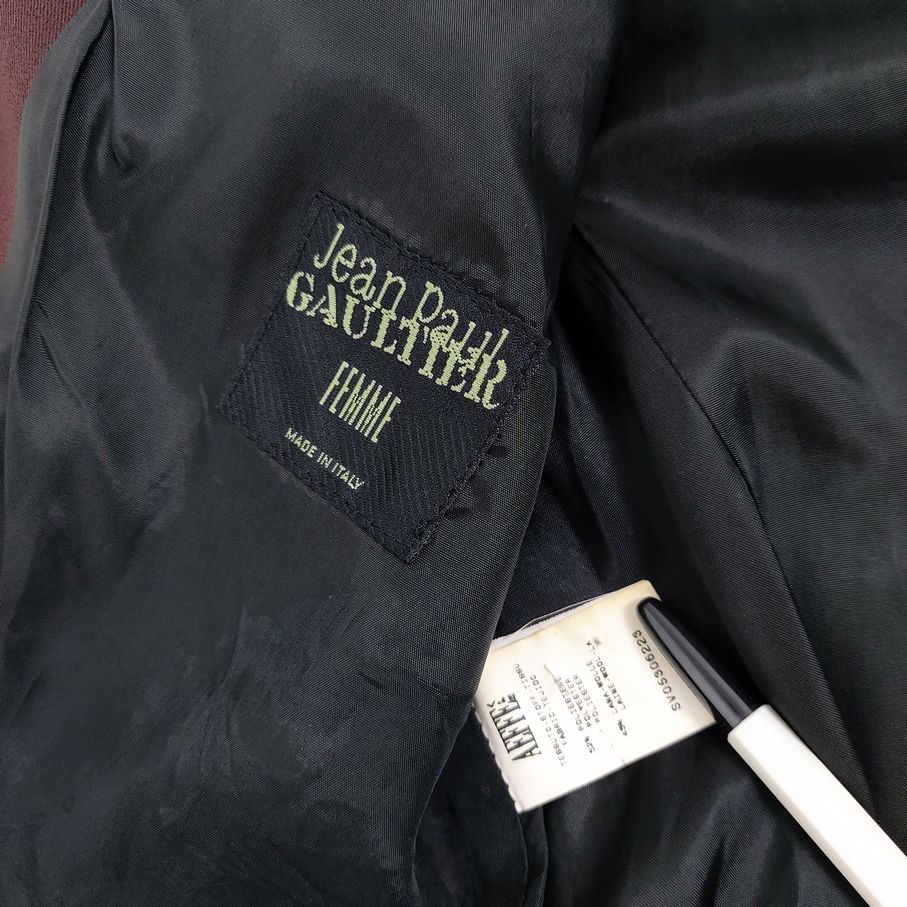 소개 드리는 제품은 FEMME 라인 블레이저로 레더 커프스가 포인트입니다. 커프스는 탈부착이 가능하여 두 가지 무드를 연출할 수 있습니다. 바디는 버건디 컬러로 세련된 느낌을 주며, 장 폴 고티에 시그니처인 백 벨트루프, 프론트 지퍼 등 완성도 높은 디테일을 자랑합니다. 여성용으로 출시되었지만 큰 사이즈라 남성 100사이즈까지도 착용 가능합니다. (런웨이 사진과 동일 제품이 아님을 참고 부탁드립니다.)
