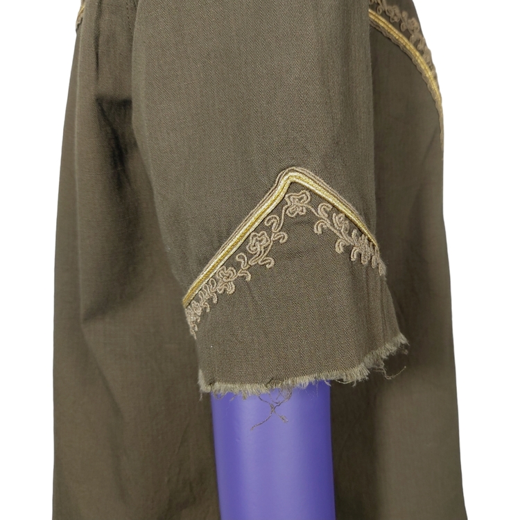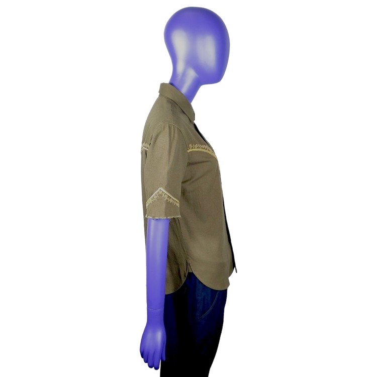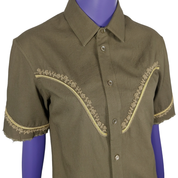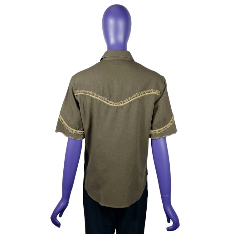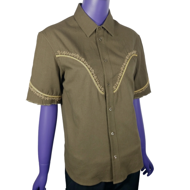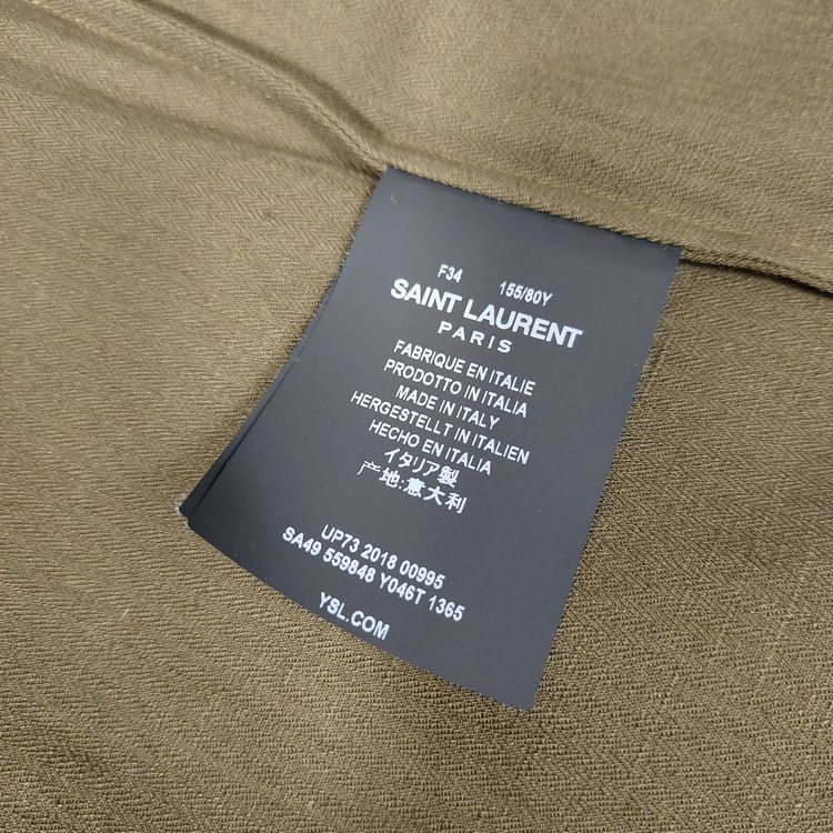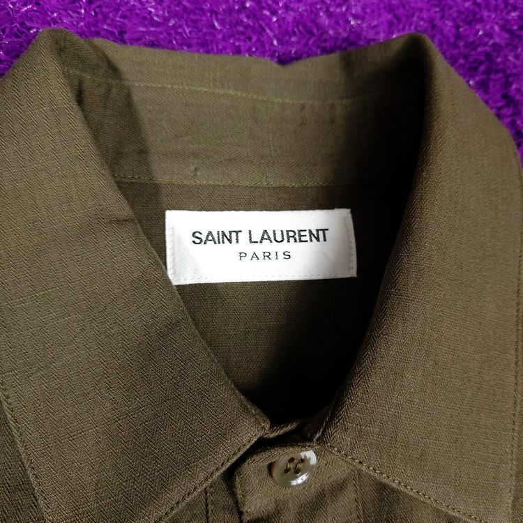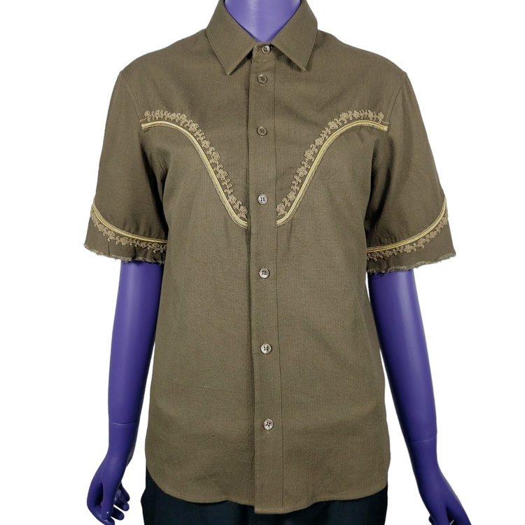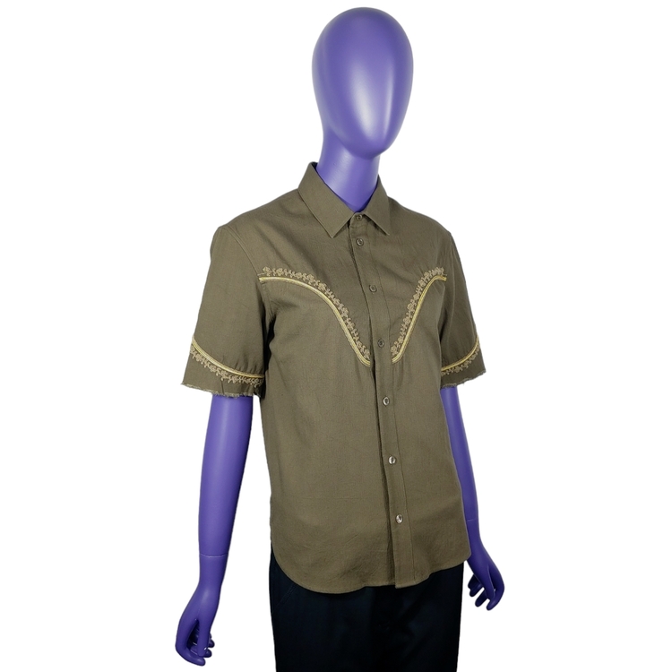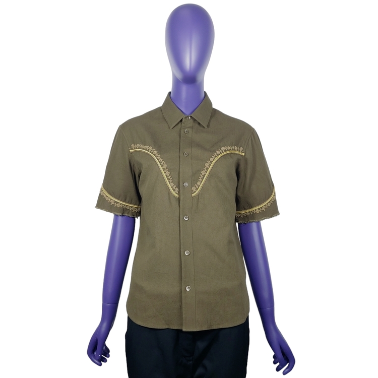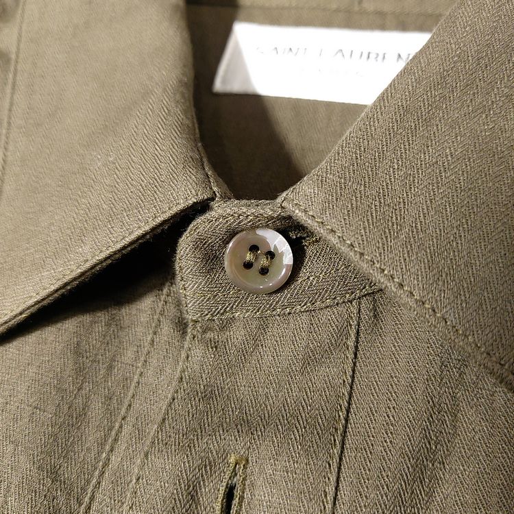 안토니 바카렐로의 생로랑 S/S 2019 시즌 제품입니다. 소매를 러프하게 자른 반팔 셔츠에 꽃 모양의 자수가 놓여 있어 웨스턴 무드를 연출하기 좋은 아이템입니다. 표기 사이즈 34이며 크게 나온 상품이므로 실측 확인 부탁드립니다. 사용감 거의 없는 깨끗한 컨디션이나 맨 위 단추 표면 일부가 깨져있습니다.