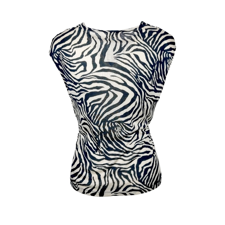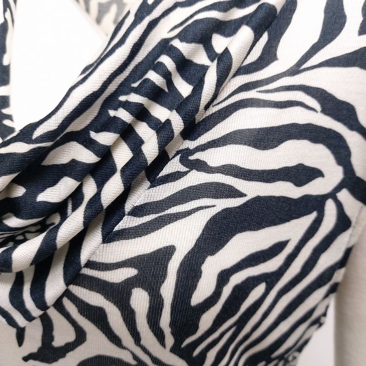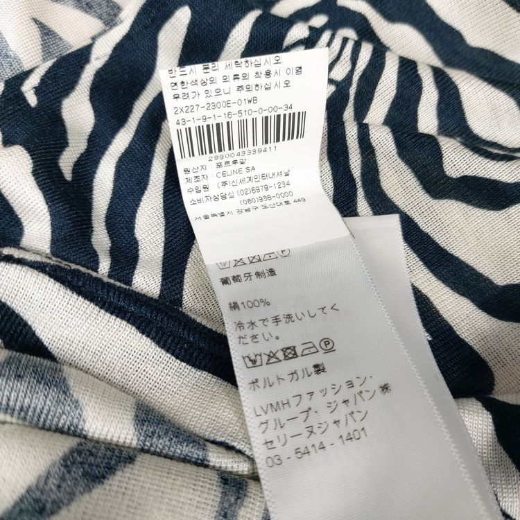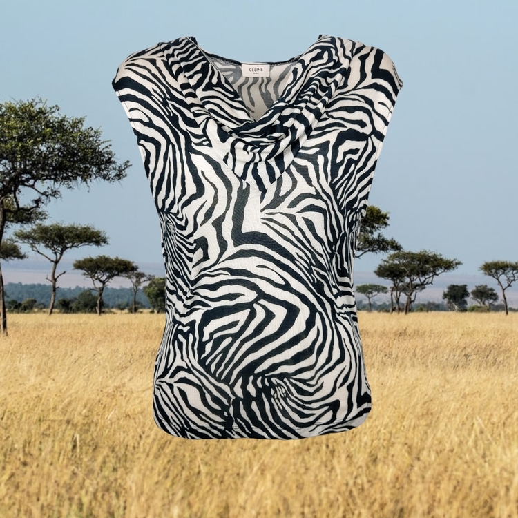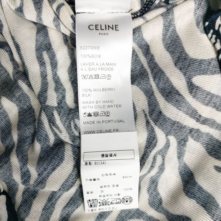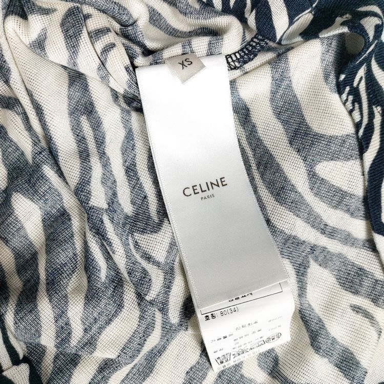 소개 드리는 제품은 지브라 프린트 슬리브리스 탑입니다. 디올옴므 시절부터 애니멀 프린트를 즐겨 쓰는 에디 슬리먼이 디자인한 지브라 패브릭으로 멀버리 실크 원단입니다. 터치감은 얇은 니트와 티셔츠의 중간 정도이며 드레이프가 멋진 카울 넥 디자인입니다. 표기 사이즈인 34보다는 여유 있게 착용하실 수 있고, 사용감 거의 없는 깨끗한 컨디션입니다.
