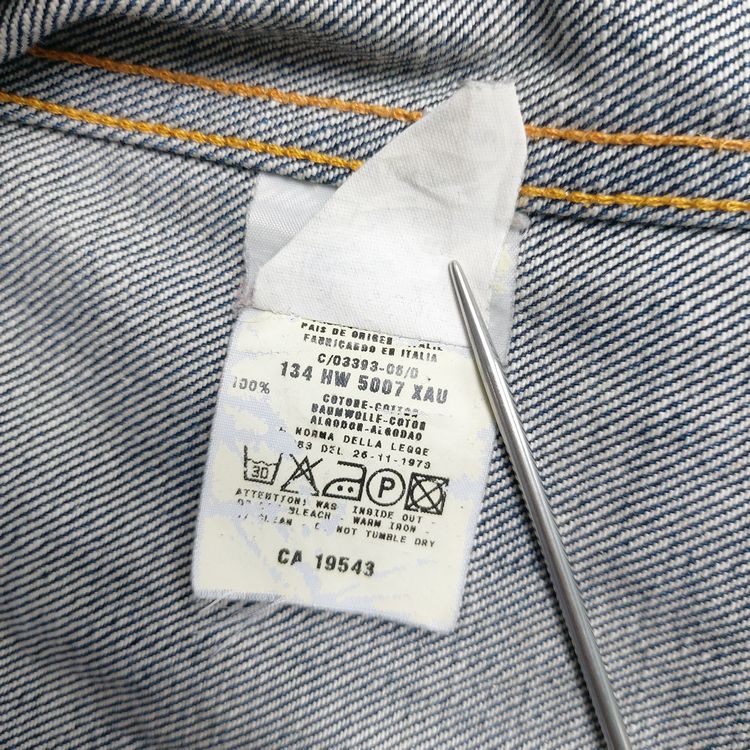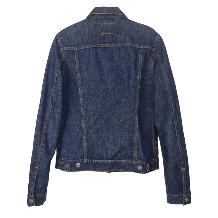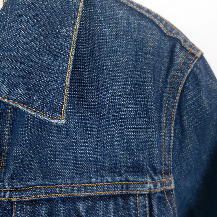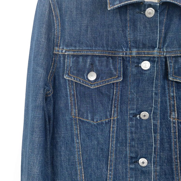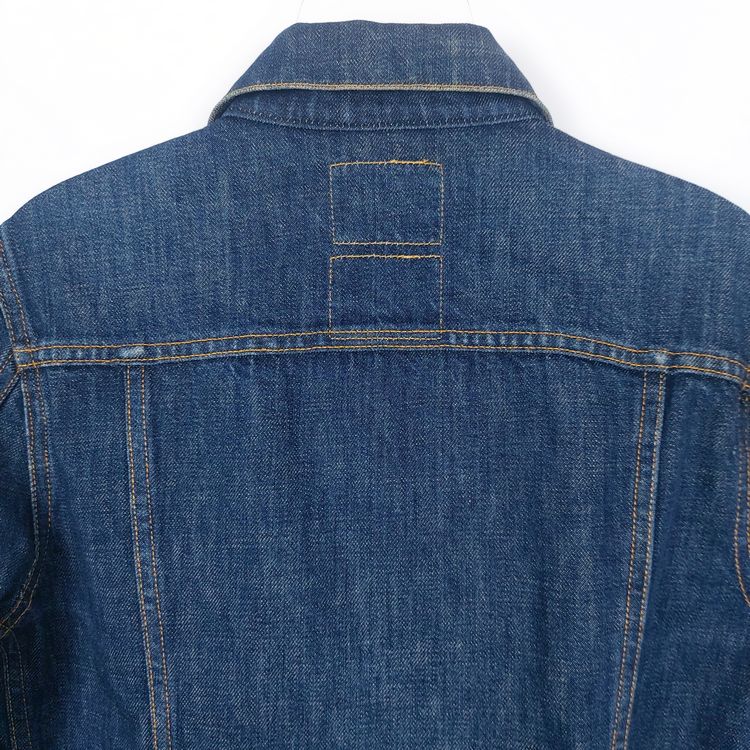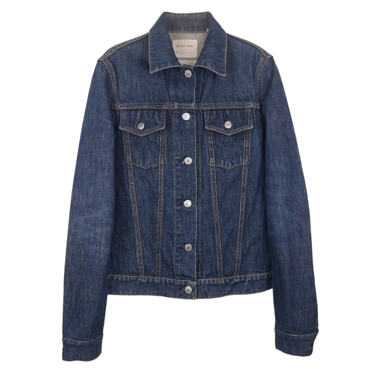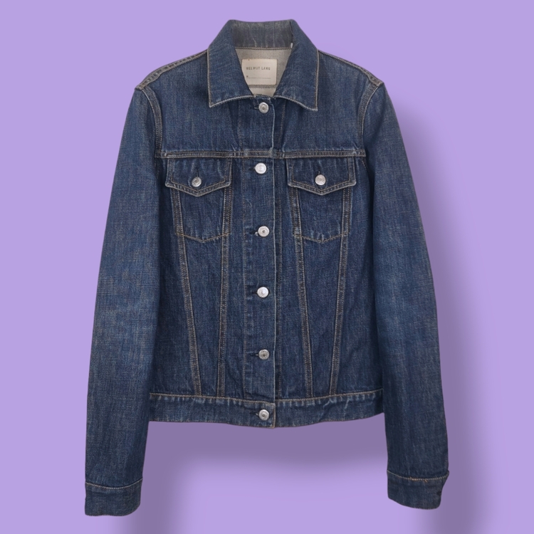 헬무트 랭 1999 클래식 데님 트러커 재킷입니다. 리바이스 3세대 트러커 재킷 디자인을 모티브로 삼은 것으로 보이며, 이미 클래식으로 자리 잡힌 아이템입니다. 세월에 따른 페이딩이 존재하며 자연스러운 사용감 외 하자는 없습니다. 표기 사이즈는 여성 40으로 실측 참고 부탁드립니다.