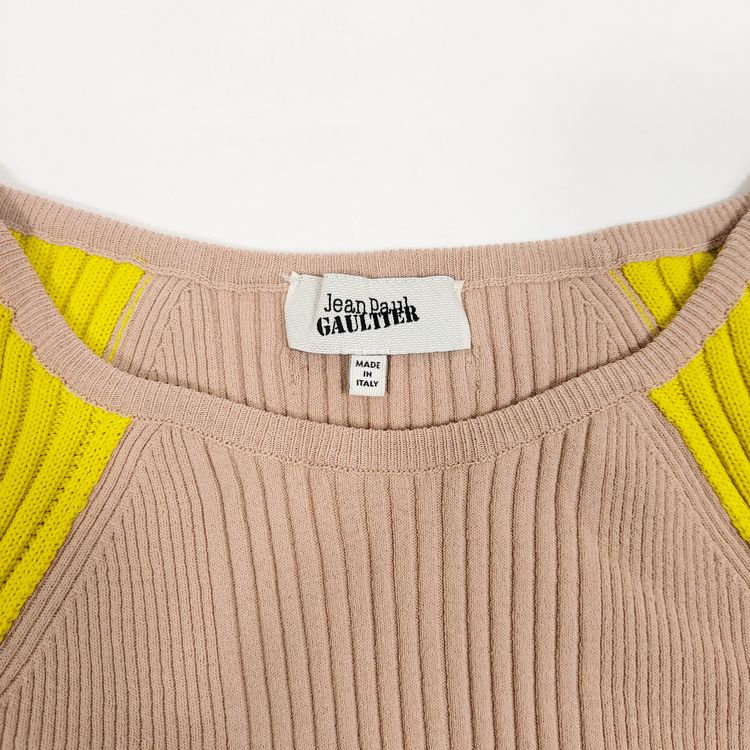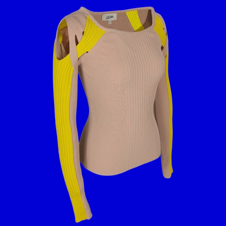 프랑스 출신 패션계의 악동, 장 폴 고티에 골지 니트 탑입니다. 숄더 컷아웃 디테일이 멋스러워 단품으로도 포인트를 줄 수 있는 아이템입니다. 표기 사이즈 여성 xs이며 신축성이 좋아 착용자의 신체에 맞게 늘어납니다. 어깨 부근 작은 올 튐 및 밑단 작은 오염 사진으로 확인 부탁드리며, 하자 제외 깨끗한 컨디션입니다!