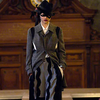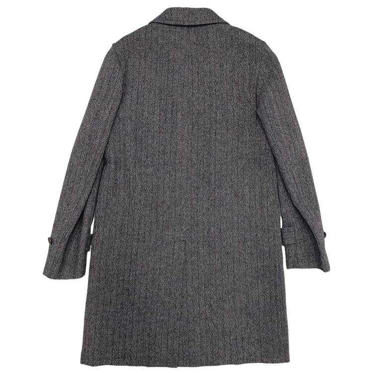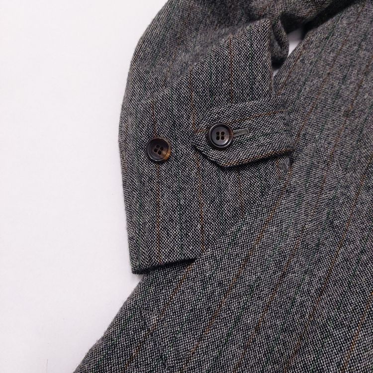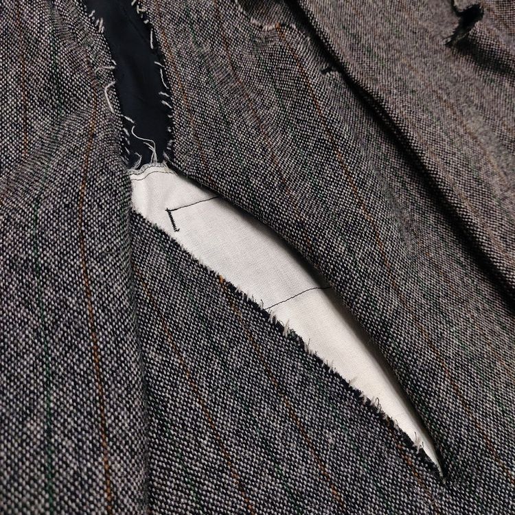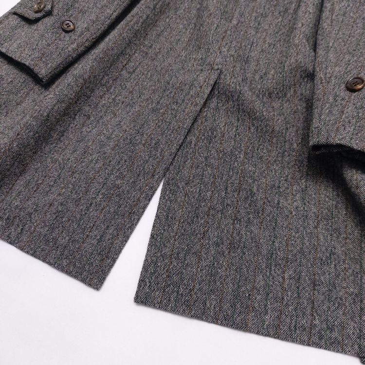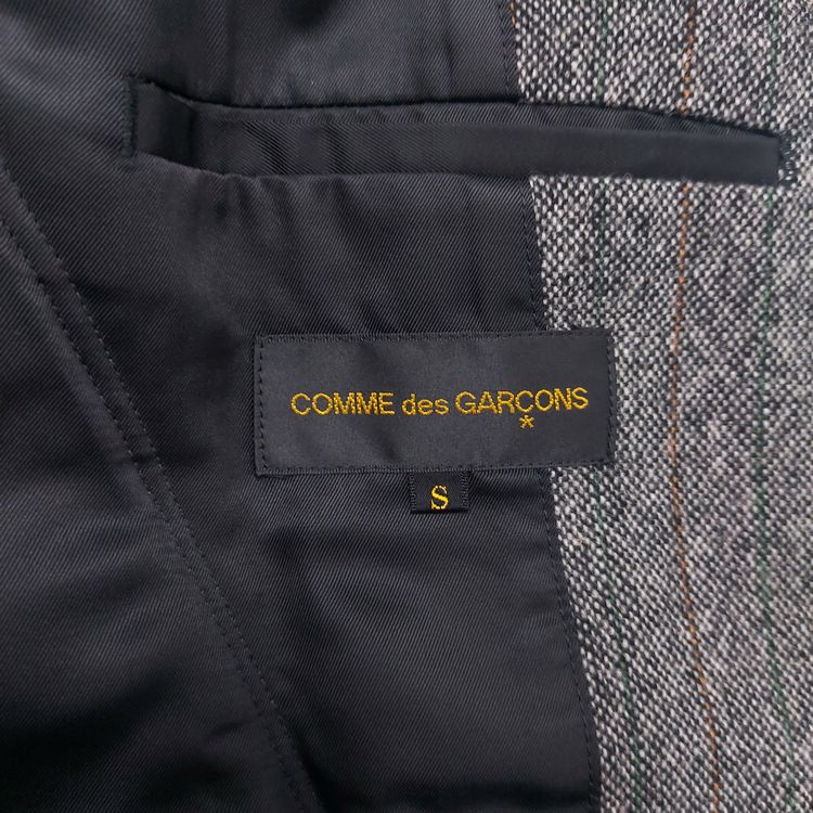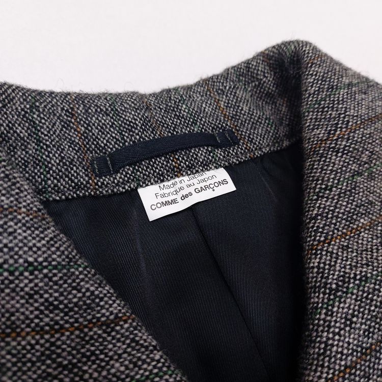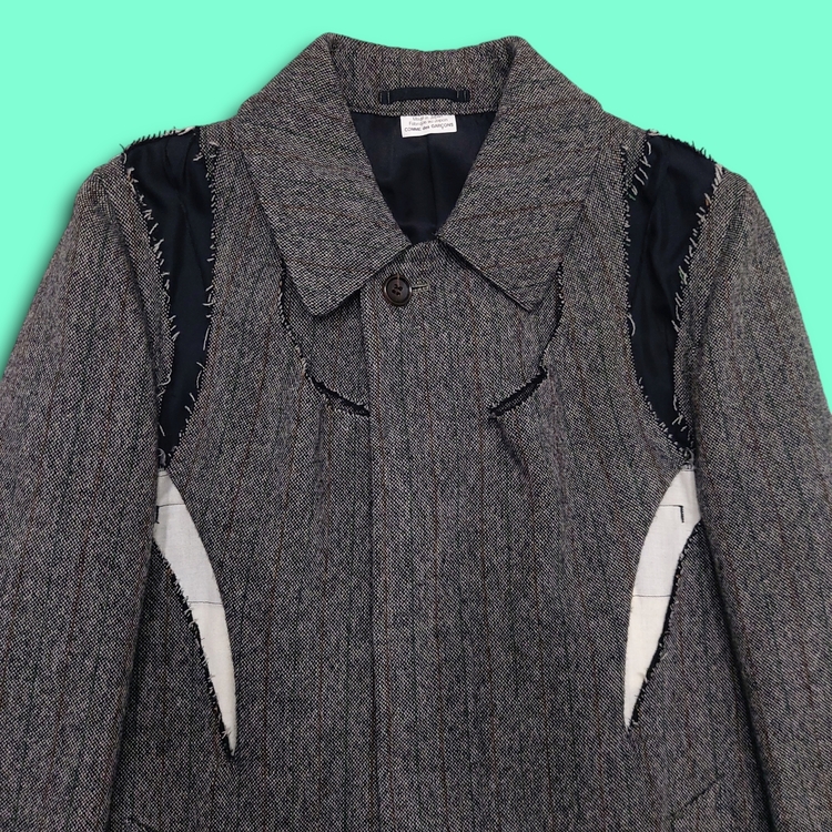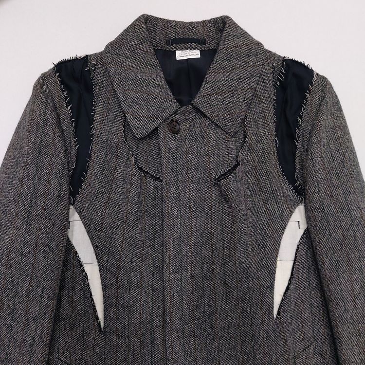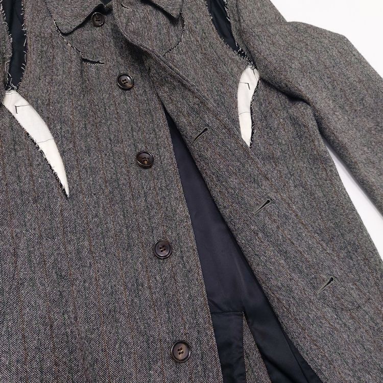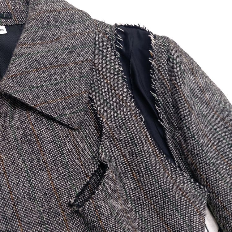 꼼 데 가르송 2006년 가을 겨울 컬렉션 24번 룩으로 등장한 피스입니다. 스트라이프 트위드 원단에 컷 아웃 디테일이 더해져 거친 느낌을 주는 아이템입니다. 싱글 벤트이며 맨 위 버튼을 제외하고는 모두 히든 버튼입니다. 새 상품에 가까운 좋은 컨디션입니다.