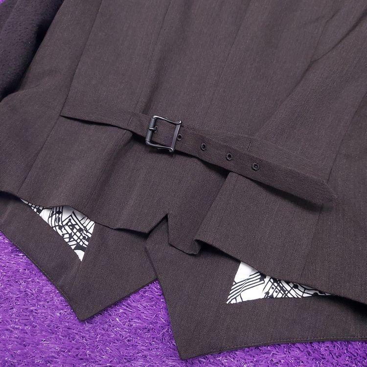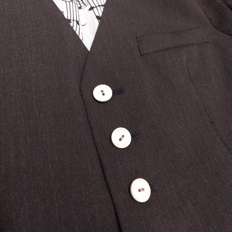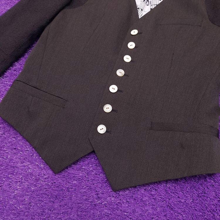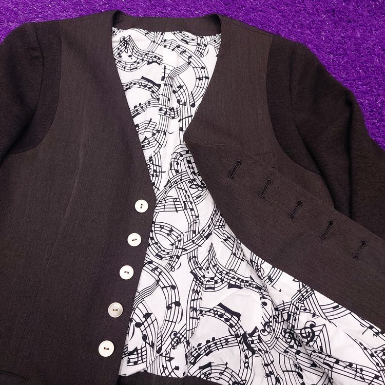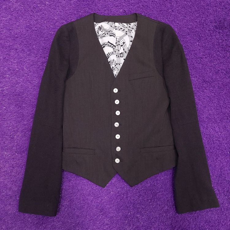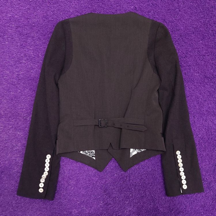 타카히로 미야시타의 넘버나인은 독보적인 무드로 두터운 매니아층을 형성하고 있습니다. 너바나의 광팬 미야시타는 커트 코베인에게 받은 영감을 많은 컬렉션에 반영했고, 여기에 웨스턴 무드가 가미된 시즌이 S/S 2007 'About a boy'입니다. 소개 드리는 제품은 음표 디테일 안감을 볼 수 있는 ss07 시즌 논카라 재킷입니다. 컬렉션 피스로 바디와 슬리브 소재가 다른 점이 특징입니다. 바디는 정장에서 볼 수 있는 매끈한 울 소재이며, 슬리브는 의도적으로 보풀을 가공한 그런지 패브릭입니다. 신치백 디테일, 9개의 소매 리얼버튼, 어깨 절개선 등 재미있는 요소가 많습니다. 주머니 실밥 제거되지 않은 좋은 컨디션이며, 남성용이지만 가장 작은 0사이즈라 여성 고객님께 더 적합합니다. 실측 확인 부탁드립니다.