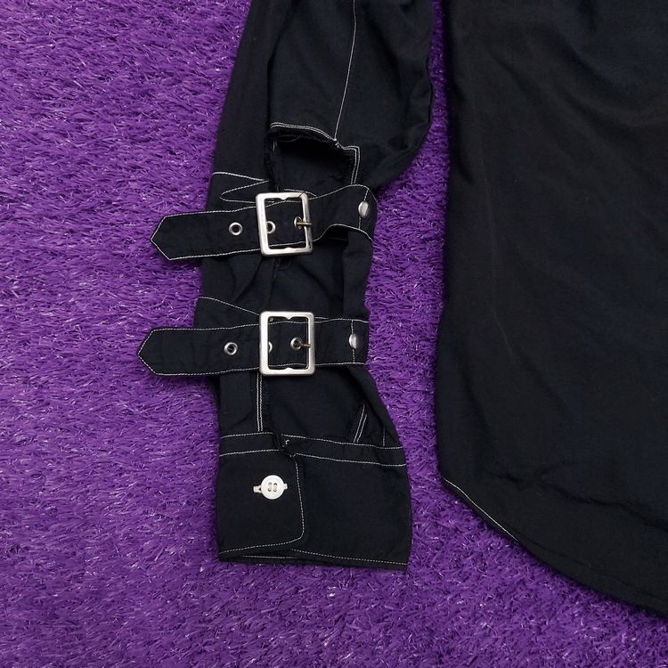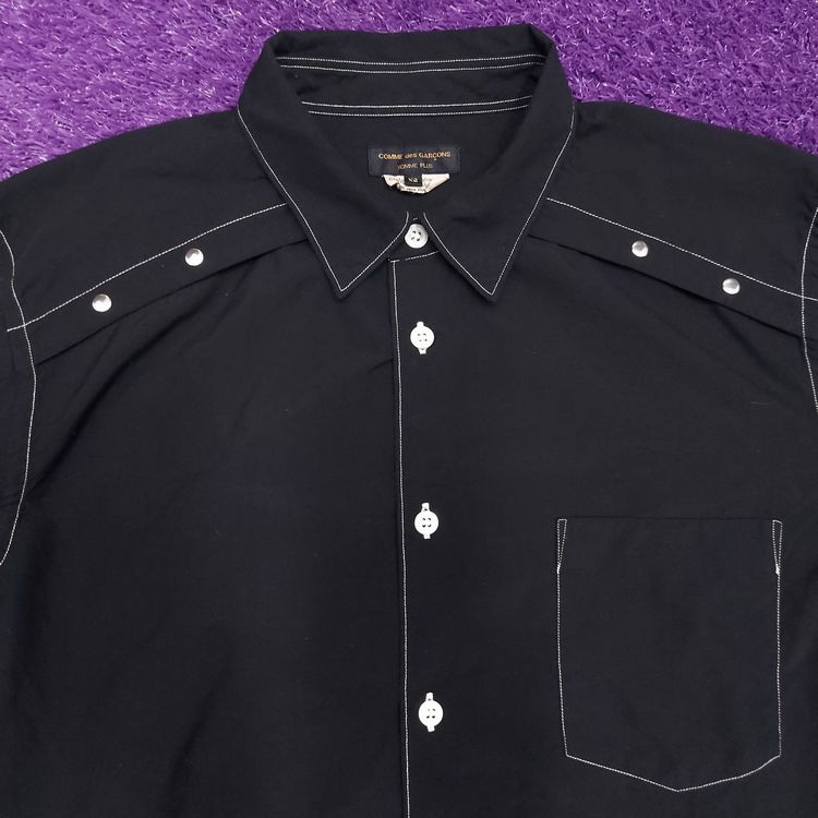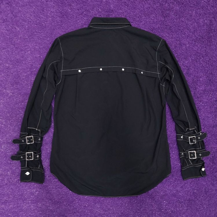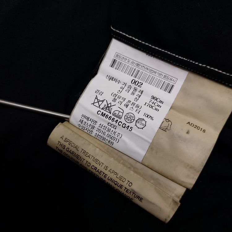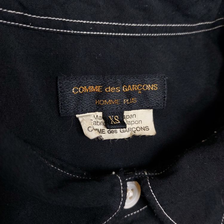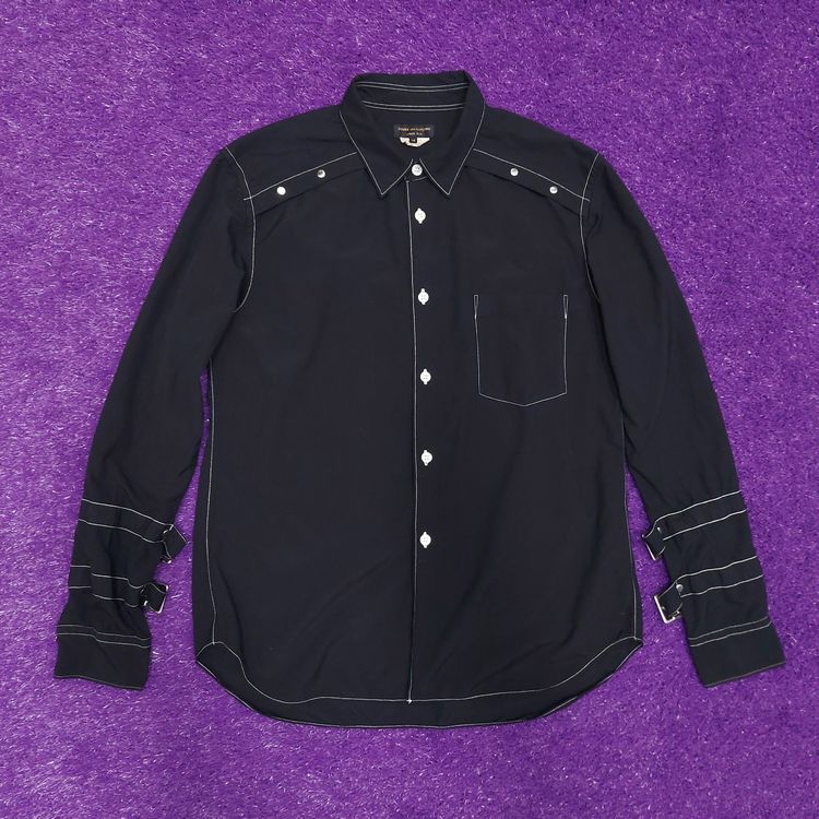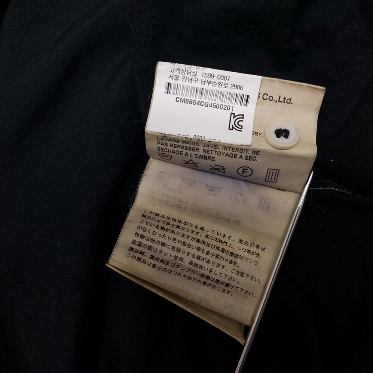 꼼 데 가르송 A/W 2016 아머 셔츠입니다. 컬렉션 타이틀 'Armour of Peace'에서 알 수 있듯 갑옷을 연상시키는 디테일이 많습니다. 메탈 소재의 소매 버클과 스터드, 그리고 아웃스티치 디테일이 특징입니다. 표기 xs인 90-95 사이즈로 여성 고객님 혹은 스키니한 남성 고객님께 추천드립니다. 큰 하자는 없으나 전반적인 원단 사용감 및 미세 보풀 존재합니다.