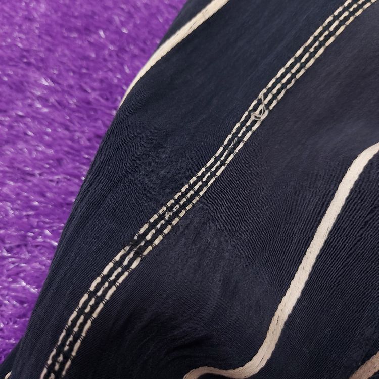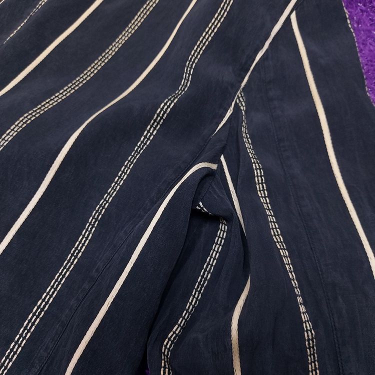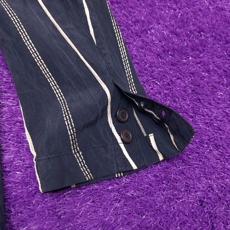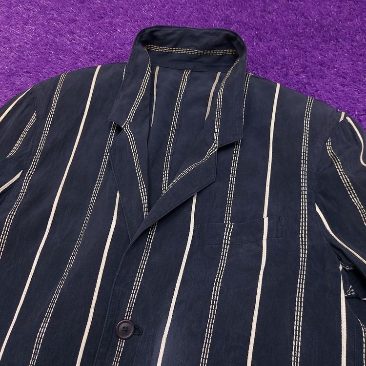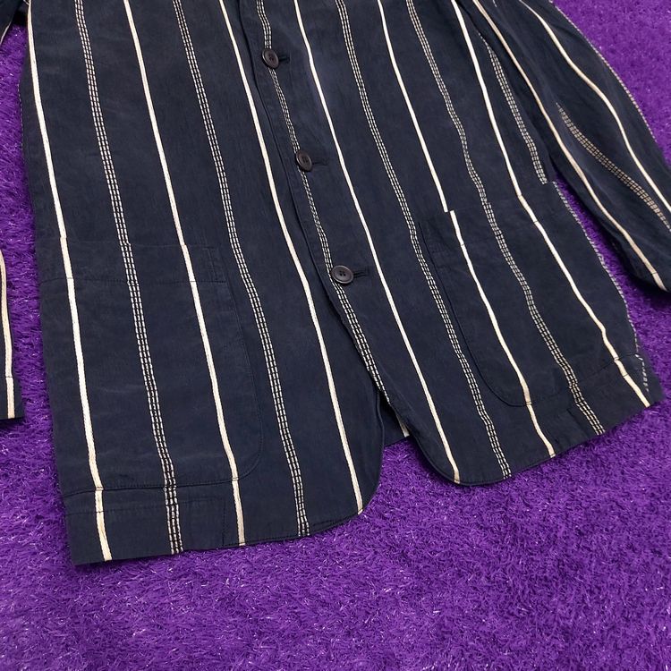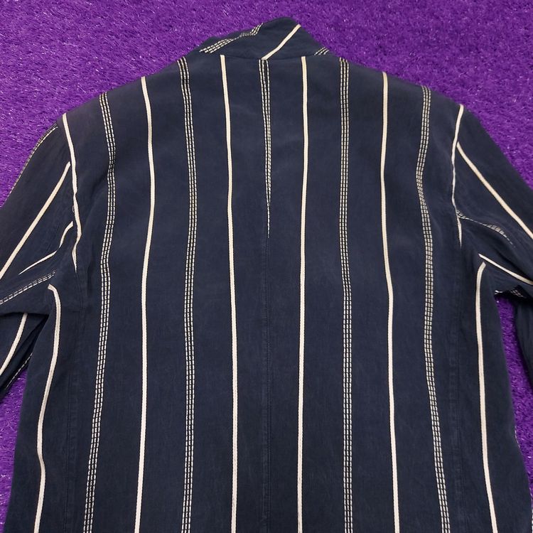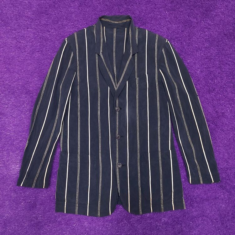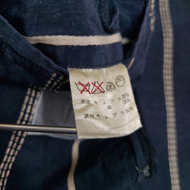 간편결제 가능이세이미야케 1980년대 멘즈 블레이저입니다. 거칠고 은은한 잔주름의 코튼+큐프라 원단과 두 종류의 세로 스트라이프 디테일이 특징인 아이템입니다. 어깨 패드가 강조되고 팔이 짧게 나왔던 동시대 다른 블레이저와는 달리 세련된 실루엣입니다. 핏은 적당히 여유있으며 총장이 길어 아방가르드한 느낌을 줍니다. 3버튼, 두 개의 아웃포켓과 행커치프 포켓이 있으며, 소매는 리얼버튼입니다. 표기 L 사이즈로 100~105 입니다. 왼쪽 어깨 후면부 약간의 변색 존재하나 빈티지 원단 특성상 크게 눈에 띄지 않습니다. 간혹 미세하게 올이 나간 스티치도 있으니 사진으로 확인 부탁드립니다!