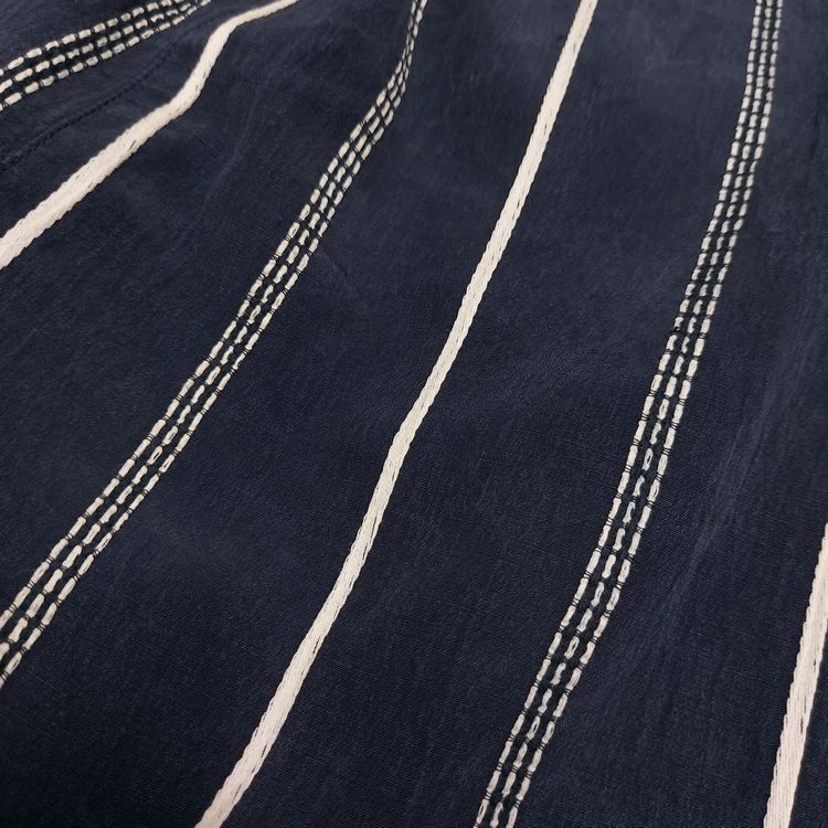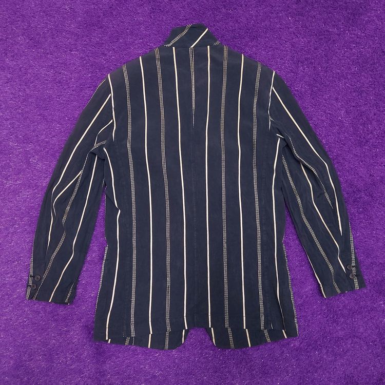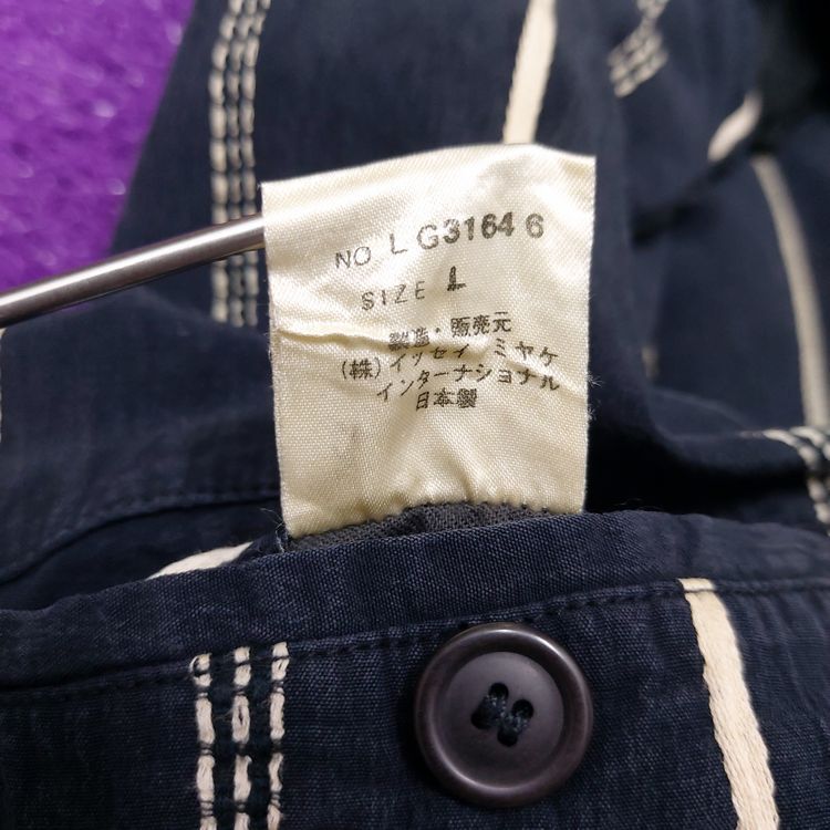 이세이미야케 1980년대 멘즈 블레이저입니다. 거칠고 은은한 잔주름의 코튼+큐프라 원단과 두 종류의 세로 스트라이프 디테일이 특징인 아이템입니다. 어깨 패드가 강조되고 팔이 짧게 나왔던 동시대 다른 블레이저와는 달리 세련된 실루엣입니다. 핏은 적당히 여유있으며 총장이 길어 아방가르드한 느낌을 줍니다. 3버튼, 두 개의 아웃포켓과 행커치프 포켓이 있으며, 소매는 리얼버튼입니다. 표기 L 사이즈로 100~105 입니다. 왼쪽 어깨 후면부 약간의 변색 존재하나 빈티지 원단 특성상 크게 눈에 띄지 않습니다. 간혹 미세하게 올이 나간 스티치도 있으니 사진으로 확인 부탁드립니다!