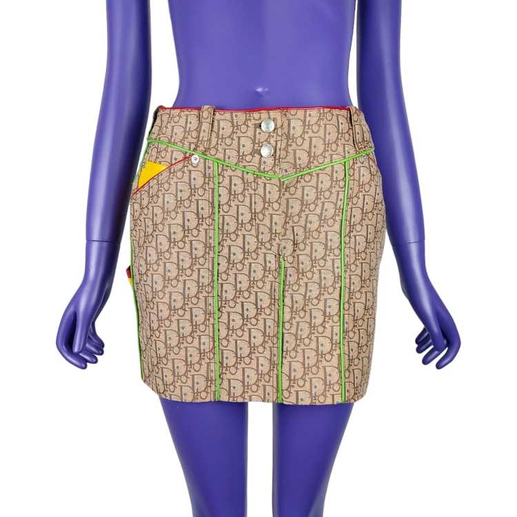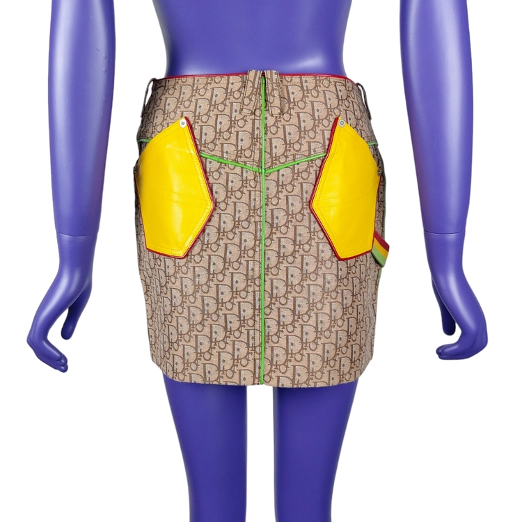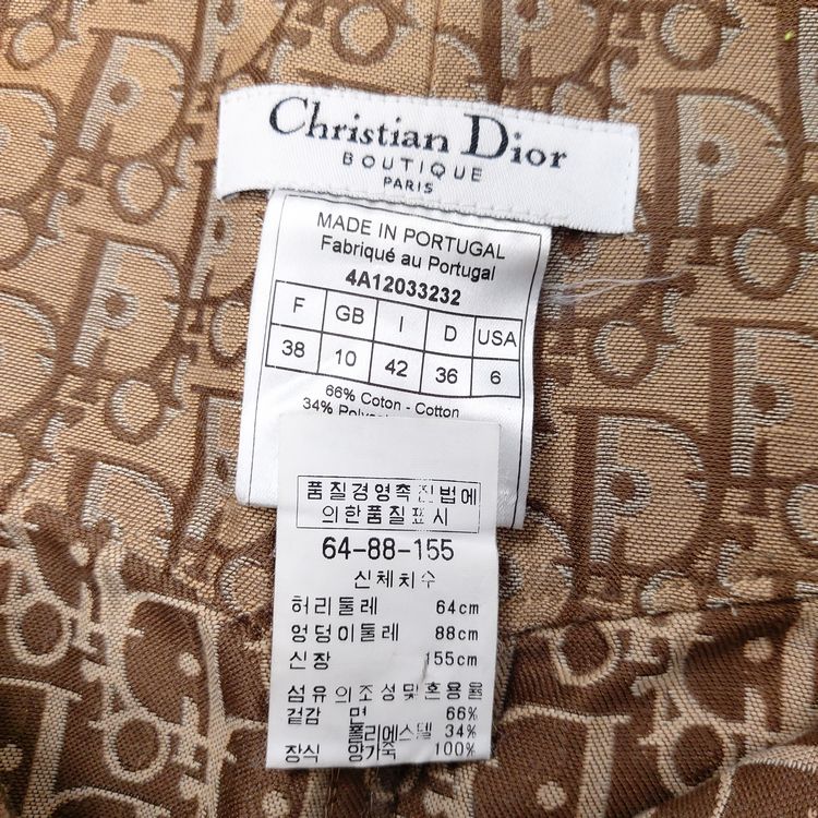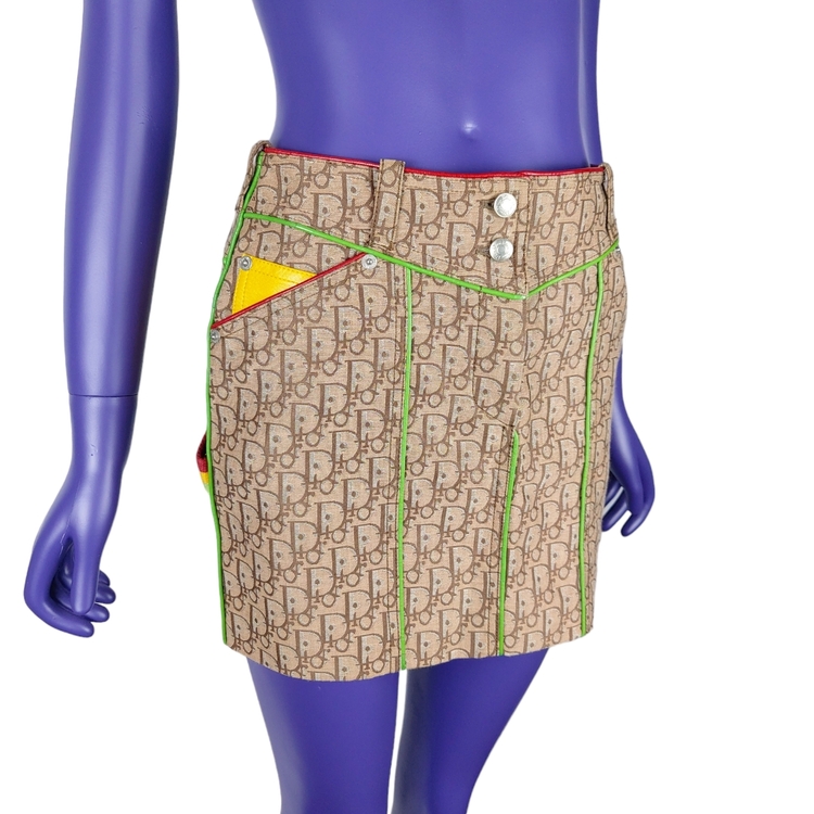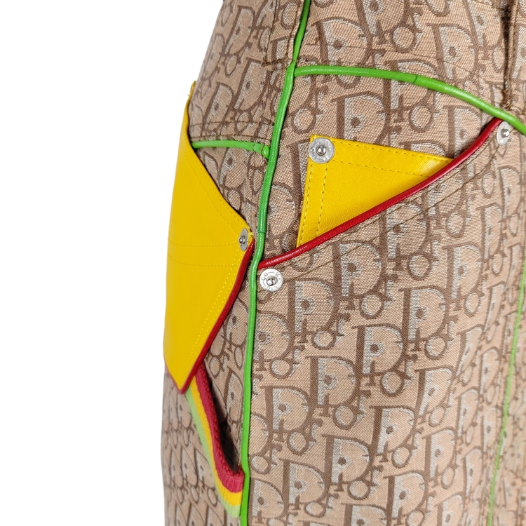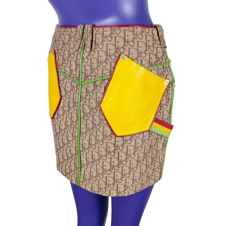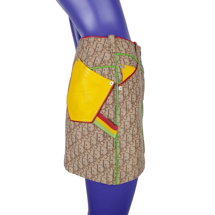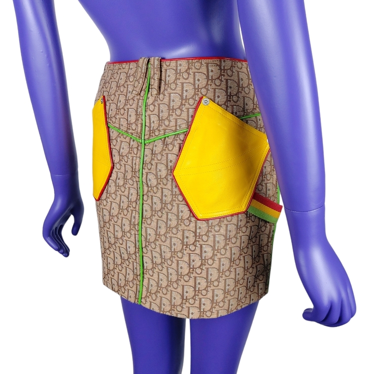 존 갈리아노가 이끌었던 전위적인 디올의 F/W 2004 스커트입니다. 2000년대 초중반에 유행했던 갈리아노의 모노그램 패턴은 현행 디올에서 유행하는 오블리크 패턴과는 다른 강렬한 느낌을 줍니다. 당시 대부분의 캠페인 작업은 포토그래퍼 닉 나이트가 디렉팅했으며, 모노그램 아이템의 전위적이고 화려한 느낌을 멋지게 연출해냈습니다. 컬러는 자메이카 라스타파리안에서 영감을 받은 라스타 시리즈로, 전 세계 갈리아노 매니아들에게 가장 많이 사랑받는 컬러 중 하나입니다. 탄탄한 원단, 레더 포켓과 레더 파이핑 디테일, 음각 버튼과 리벳 등 디테일까지 웰메이드인 명작입니다. 새상품에 가까운 컨디션이나 부속품인 벨트는 없습니다. 34, 38 사이즈 두 점 소개드립니다. 갈리아노 시절 디올 특성상 사이즈가 작은 편으로 실측 확인 부탁드립니다!