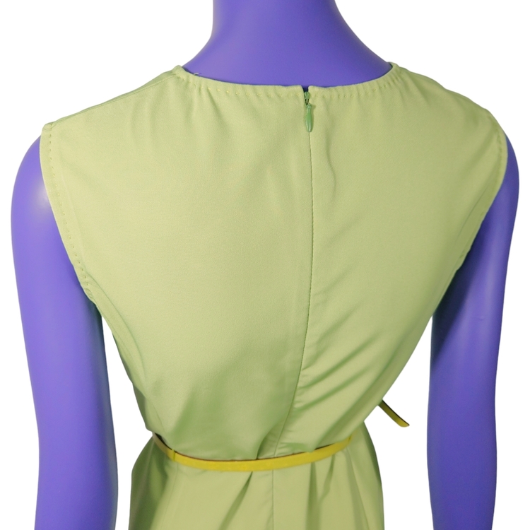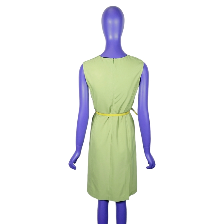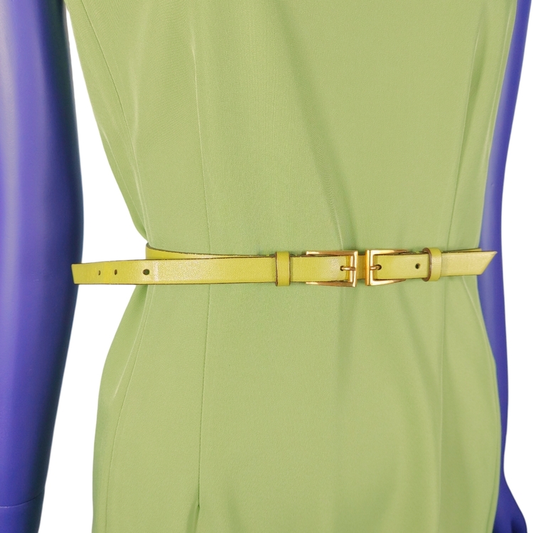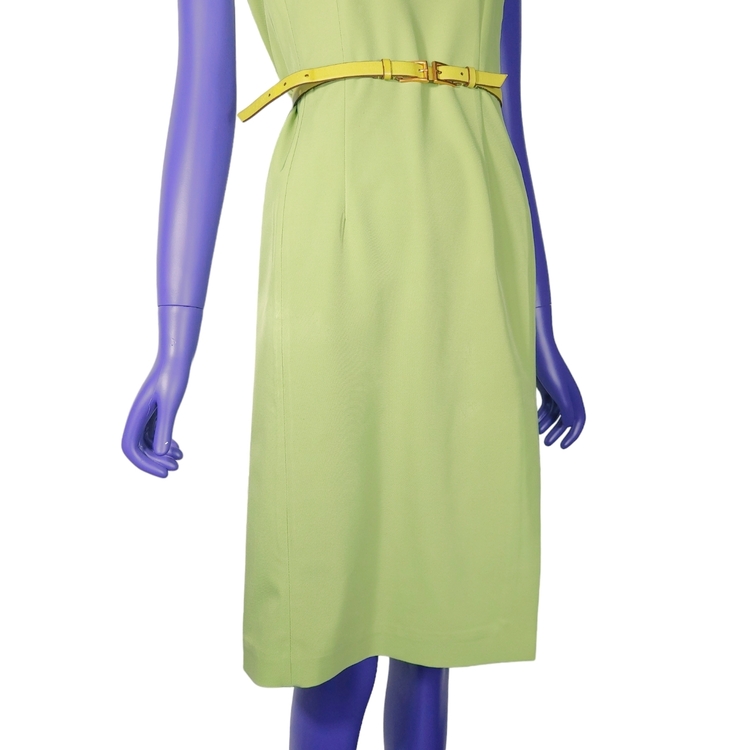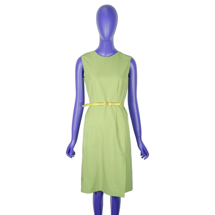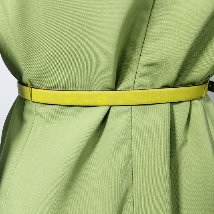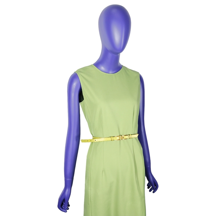 1990년대 프라다 미디 원피스입니다. 라임 그린 컬러와 슬리브리스 조합이 경쾌한 느낌을 주는 아이템입니다. 폴리에스터 엘라스틴 혼방의 우븐 원단으로 견고하며, 버클이 2개인 벨트로 허리 라인을 강조할 수 있습니다. 표기 사이즈 40입니다. 전반적으로 깨끗한 컨디션이나 벨트에 얼룩이 존재하며, 세탁 과정에서 케어라벨 글씨가 지워졌으므로 참고 부탁드립니다.