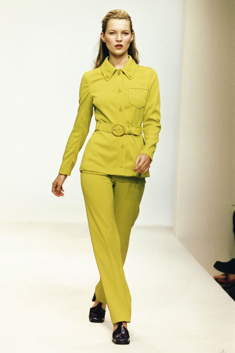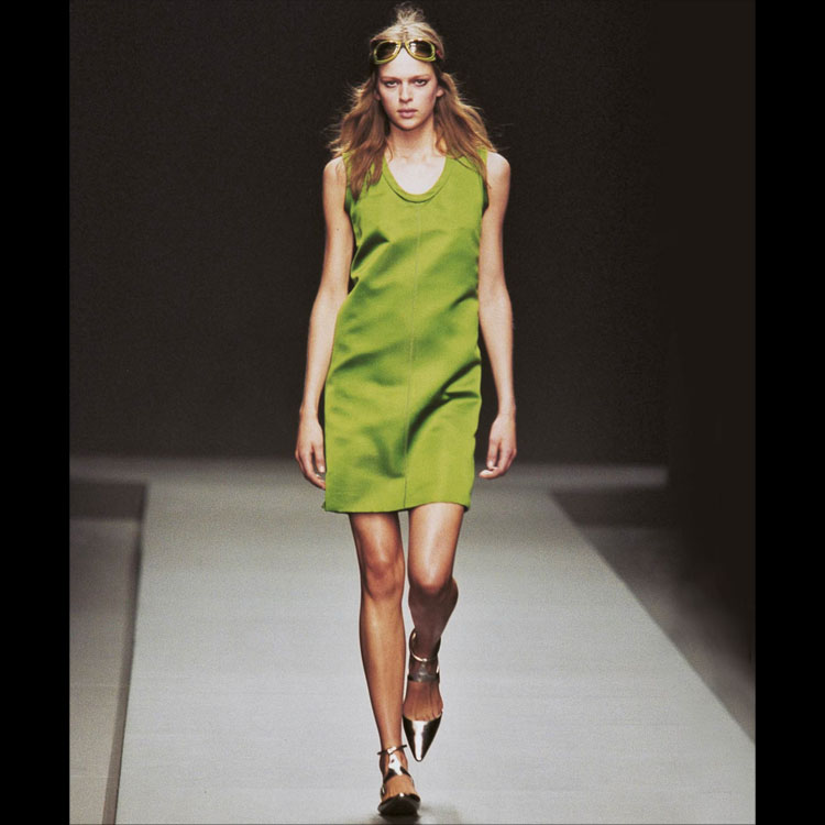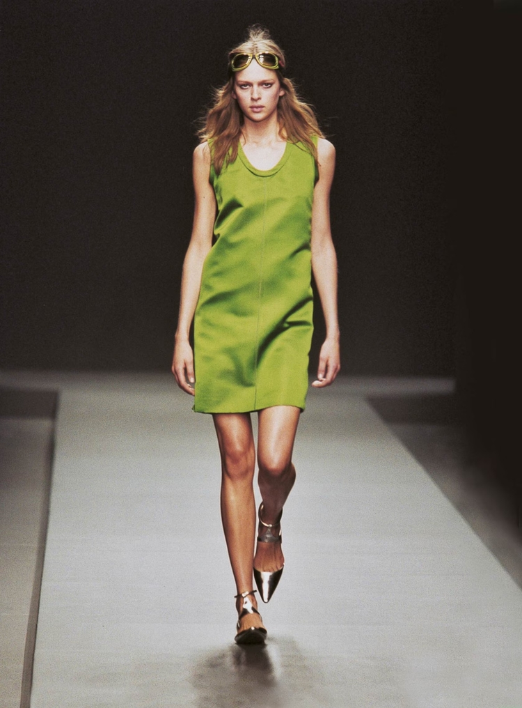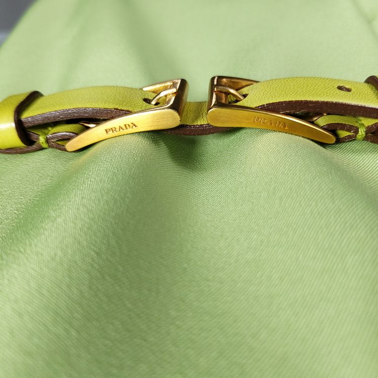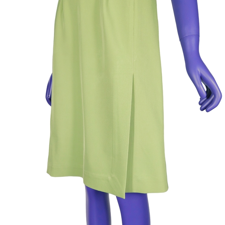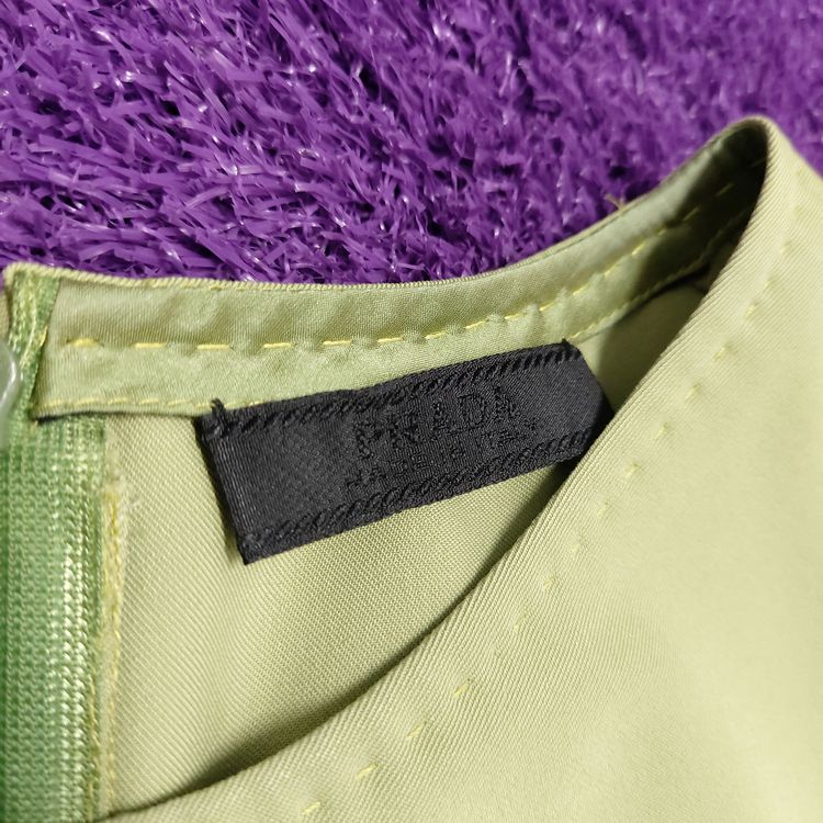 1990년대 프라다 미디 원피스입니다. 라임 그린 컬러와 슬리브리스 조합이 경쾌한 느낌을 주는 아이템입니다. 폴리에스터 엘라스틴 혼방의 우븐 원단으로 견고하며, 버클이 2개인 벨트로 허리 라인을 강조할 수 있습니다. 표기 사이즈 40입니다. 전반적으로 깨끗한 컨디션이나 벨트에 얼룩이 존재하며, 세탁 과정에서 케어라벨 글씨가 지워졌으므로 참고 부탁드립니다.